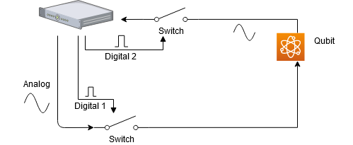 To understand how digital signals are treated, we concider the following example where we output an analog signal through a switch. There is now one analog input to the quantum element, from which the analog waveform is played, and one digital input which is used to open the switch. The signal is then collected via switch and a quantum element output as is shown in the figure below.